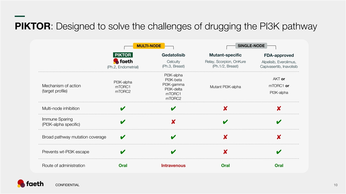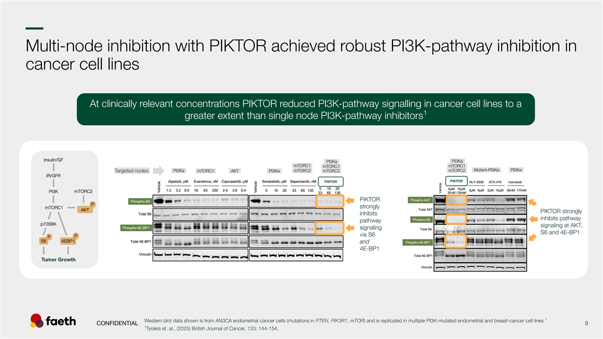 –– umor GrTowth Multi-node inhibition with PIKTOR achieved robust PI3K-pathway inhibition in cancer cell lines At clinically relevant concentrations PIKTOR reduced PI3K-pathway signalling in cancer cell lines to a 1 greater extent than single node PI3K-pathway inhibitors –PI3Ka– –PI3Ka– -mTORC1- -mTORC1- -mTORC1- –Mutant-PI3Ka– –PI3Ka– –PI3Ka– -mTORC2- -mTORC2- Targeted nodes: -mTORC1- –AKT– –PI3Ka– -mTORC2- PIKTOR PIKTOR PIKTOR strongly AKT PIKTOR strongly inhibits inhibits pathway pathway signaling at AKT, signaling S6 and 4E-BP1 via S6 and 4E-BP1 1 Western blot data shown is from AN3CA endometrial cancer cells (mutations in PTEN, PIK3R1, mTOR) and is replicated in multiple PI3K-mutated endometrial and breast-cancer cell lines CONFIDENTIAL 9 1 Tyrakis et. al., (2025) British Journal of Cancer, 133: 144-154.