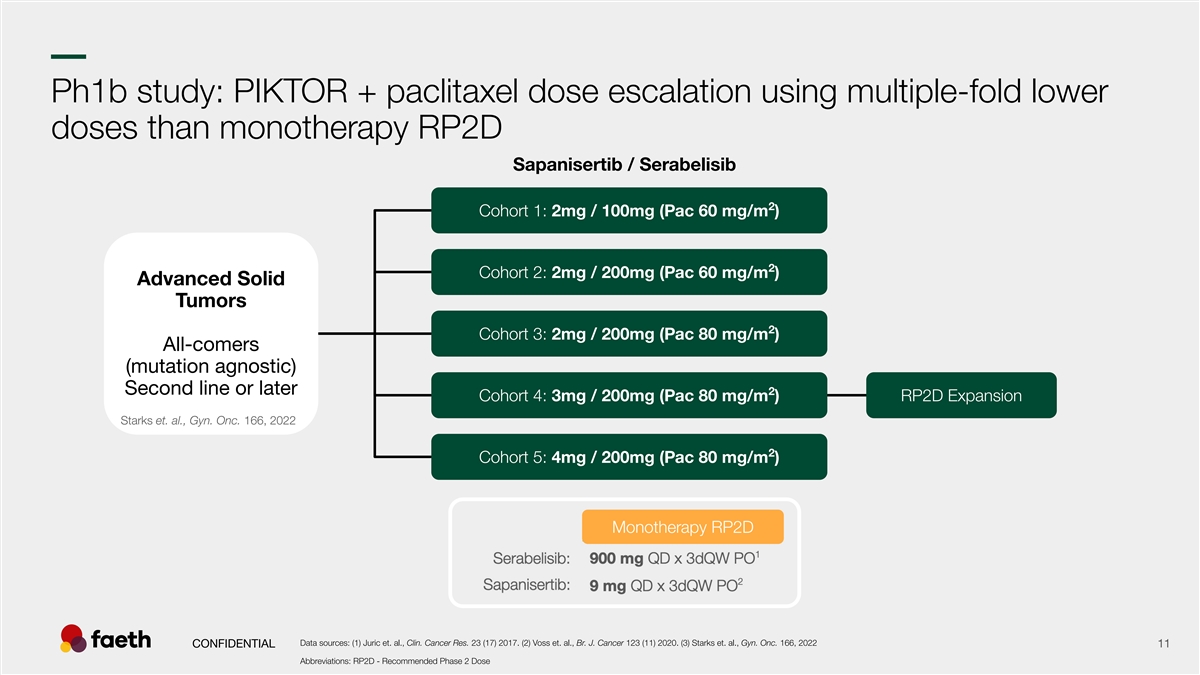 –– PIKTOR: Designed to solve the challenges of drugging the PI3K pathway SINGLE-NODE MULTI-NODE -PIKTOR- Gedatolisib Mutant-specific FDA-approved Celcuity Relay, Scorpion, OnKure Alpelisib, Everolimus, Faeth (Ph.3, Breast) (Ph.1/2, Breast) Capivasertib, Inavolisib (Ph.2, Endometrial) PI3K-alpha AKT or PI3K-beta PI3K-alpha PI3K-gamma mTORC1 or Mechanism of action mTORC1 Mutant PI3K-alpha PI3K-delta (target profile) mTORC2 PI3K-alpha mTORC1 mTORC2 Multi-node inhibition ✔✔ ✘✘ Immune Sparing ✔✔✔ ✘ (PI3K-alpha specific) Broad pathway mutation coverage ✔✔ ✘✘ Prevents wt-PI3K escape ✔✔✔ ✘ Route of administration Oral Intravenous Oral Oral CONFIDENTIAL 10