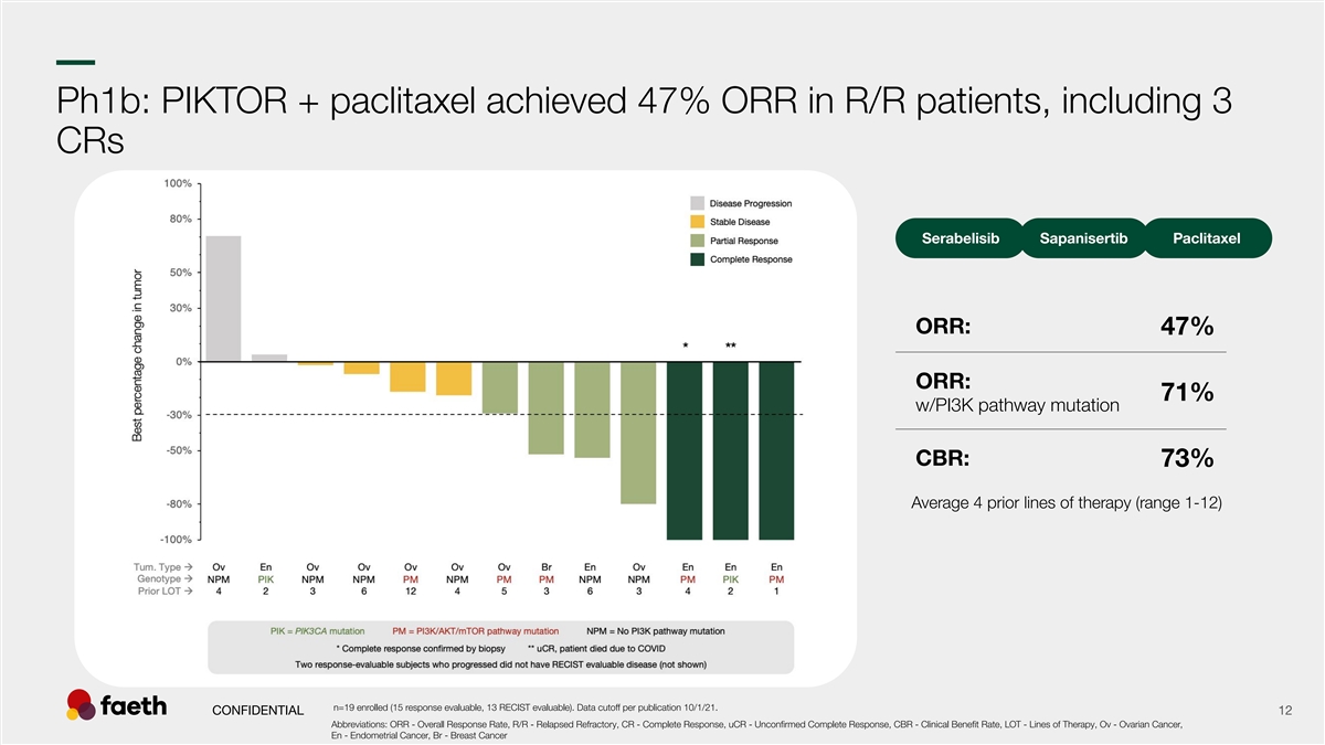 –– Ph1b study: PIKTOR + paclitaxel dose escalation using multiple-fold lower doses than monotherapy RP2D Sapanisertib / Serabelisib 2 Cohort 1: 2mg / 100mg (Pac 60 mg/m ) 2 Cohort 2: 2mg / 200mg (Pac 60 mg/m ) Advanced Solid Tumors 2 Cohort 3: 2mg / 200mg (Pac 80 mg/m ) All-comers (mutation agnostic) Second line or later 2 Cohort 4: 3mg / 200mg (Pac 80 mg/m ) RP2D Expansion Starks et. al., Gyn. Onc. 166, 2022 2 Cohort 5: 4mg / 200mg (Pac 80 mg/m ) Monotherapy RP2D Data sources: (1) Juric et. al., Clin. Cancer Res. 23 (17) 2017. (2) Voss et. al., Br. J. Cancer 123 (11) 2020. (3) Starks et. al., Gyn. Onc. 166, 2022 CONFIDENTIAL 11 Abbreviations: RP2D - Recommended Phase 2 Dose