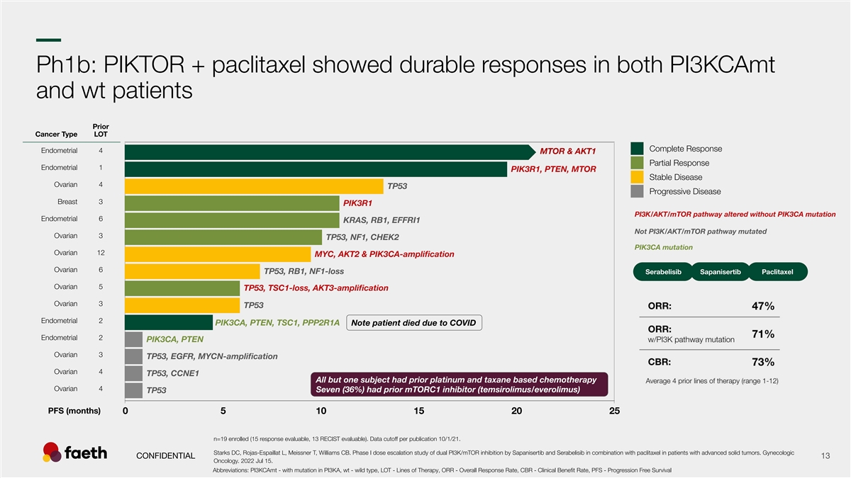 –– Ph1b: PIKTOR + paclitaxel achieved 47% ORR in R/R patients, including 3 CRs Serabelisib Sapanisertib Paclitaxel ORR: 47% 12 ORR: 71% w/PI3K pathway mutation CBR: 73% Average 4 prior lines of therapy (range 1-12) n=19 enrolled (15 response evaluable, 13 RECIST evaluable). Data cutoff per publication 10/1/21. CONFIDENTIAL 12 Abbreviations: ORR - Overall Response Rate, R/R - Relapsed Refractory, CR - Complete Response, uCR - Unconfirmed Complete Response, CBR - Clinical Benefit Rate, LOT - Lines of Therapy, Ov - Ovarian Cancer, En - Endometrial Cancer, Br - Breast Cancer