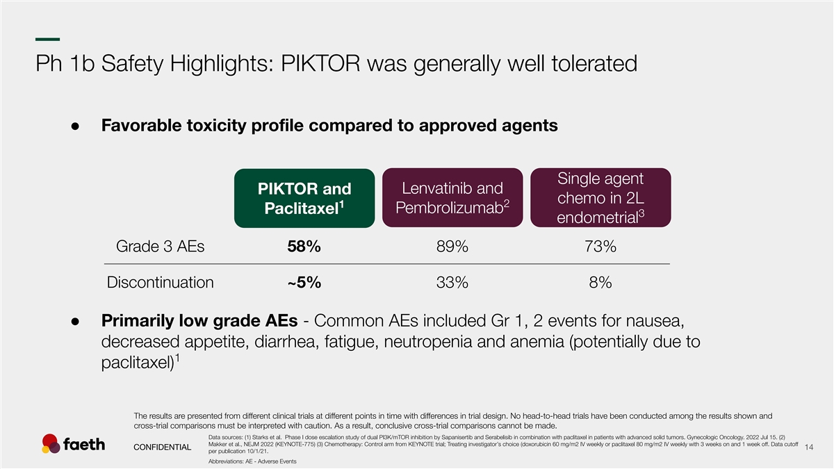 –– Ph1b: PIKTOR + paclitaxel showed durable responses in both PI3KCAmt and wt patients Prior Cancer Type LOT Complete Response Endometrial 4 MTOR & AKT1 Partial Response Endometrial 1 PIK3R1, PTEN, MTOR Stable Disease Ovarian 4 TP53 Progressive Disease Breast 3 PIK3R1 PI3K/AKT/mTOR pathway altered without PIK3CA mutation Endometrial 6 KRAS, RB1, EFFRI1 Not PI3K/AKT/mTOR pathway mutated Ovarian 3 TP53, NF1, CHEK2 PIK3CA mutation Ovarian 12 MYC, AKT2 & PIK3CA-amplification Ovarian 6 TP53, RB1, NF1-loss Serabelisib Sapanisertib Paclitaxel Ovarian 5 TP53, TSC1-loss, AKT3-amplification Ovarian 3 TP53 Endometrial 2 PIK3CA, PTEN, TSC1, PPP2R1A Note patient died due to COVID Endometrial 2 PIK3CA, PTEN Ovarian 3 TP53, EGFR, MYCN-amplification Ovarian 4 TP53, CCNE1 All but one subject had prior platinum and taxane based chemotherapy Ovarian 4 Seven (36%) had prior mTORC1 inhibitor (temsirolimus/everolimus) TP53 PFS (months) 0 5 10 15 20 25 n=19 enrolled (15 response evaluable, 13 RECIST evaluable). Data cutoff per publication 10/1/21. Starks DC, Rojas-Espaillat L, Meissner T, Williams CB. Phase I dose escalation study of dual PI3K/mTOR inhibition by Sapanisertib and Serabelisib in combination with paclitaxel in patients with advanced solid tumors. Gynecologic CONFIDENTIAL 13 Oncology. 2022 Jul 15. Abbreviations: PI3KCAmt - with mutation in PI3KA, wt - wild type, LOT - Lines of Therapy, ORR - Overall Response Rate, CBR - Clinical Benefit Rate, PFS - Progression Free Survival