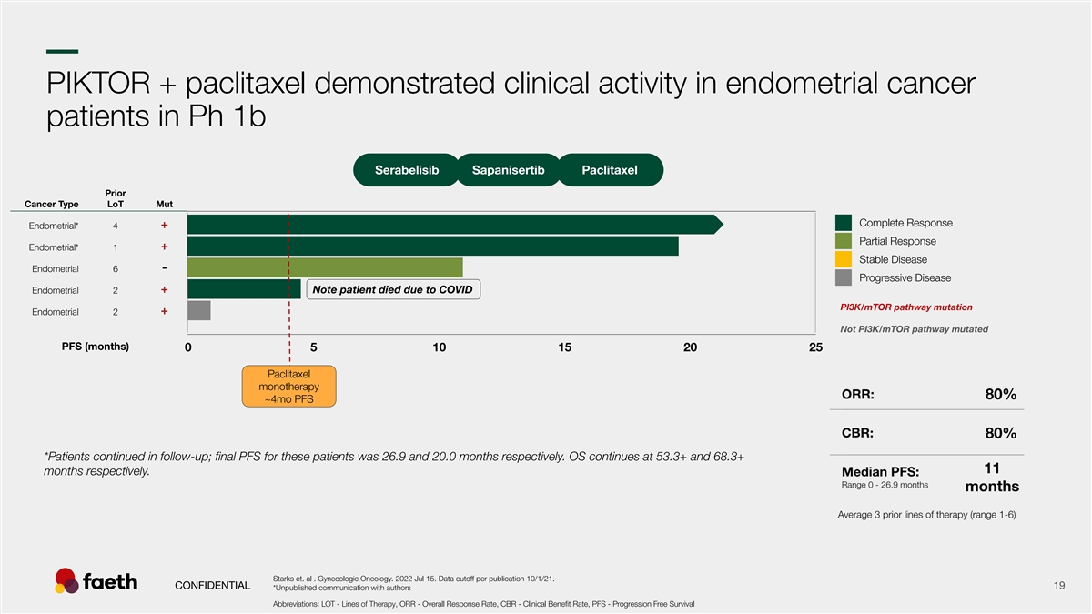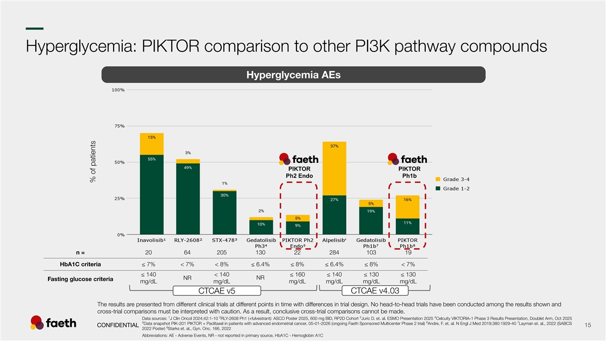 –– Hyperglycemia: PIKTOR comparison to other PI3K pathway compounds Hyperglycemia AEs PIKTOR PIKTOR Ph2 Endo Ph1b n = 20 64 205 130 22 284 103 19 HbA1C criteria ≤ 7% < 7% < 8% ≤ 6.4% ≤ 8% ≤ 6.4% ≤ 8% < 7% ≤ 140 < 140 ≤ 160 ≤ 140 ≤ 130 ≤ 130 NR NR Fasting glucose criteria mg/dL mg/dL mg/dL mg/dL mg/dL mg/dL CTCAE v4.03 CTCAE v5 The results are presented from different clinical trials at different points in time with differences in trial design. No head-to-head trials have been conducted among the results shown and cross-trial comparisons must be interpreted with caution. As a result, conclusive cross-trial comparisons cannot be made. 1 2 3 4 Data sources: J Clin Oncol 2024;42:1-10 RLY-2608 Ph1 (+fulvestrant): ASCO Poster 2025, 600 mg BID, RP2D Cohort Juric D. et. al. ESMO Presentation 2025 Celcuity VIKTORIA-1 Phase 3 Results Presentation, Doublet Arm, Oct 2025 5 6 7 Data snapshot PIK-201 PIKTOR + Paclitaxel in patients with advanced endometrial cancer, 05-01-2026 (ongoing Faeth Sponsored Multicenter Phase 2 trial) Andre, F. et. al. N Engl J Med 2019;380:1929-40 Layman et. al., 2022 (SABCS CONFIDENTIAL 15 8 2022 Poster) Starks et. al., Gyn. Onc. 166, 2022 Abbreviations: AE - Adverse Events, NR - not reported in primary source, HbA1C - Hemoglobin A1C % of patients