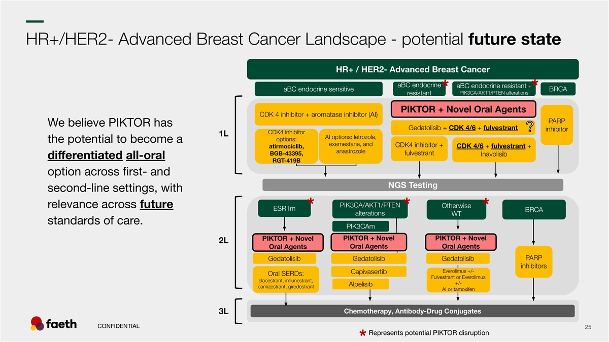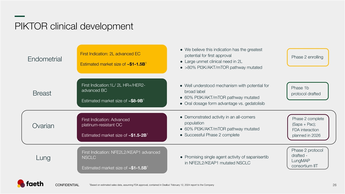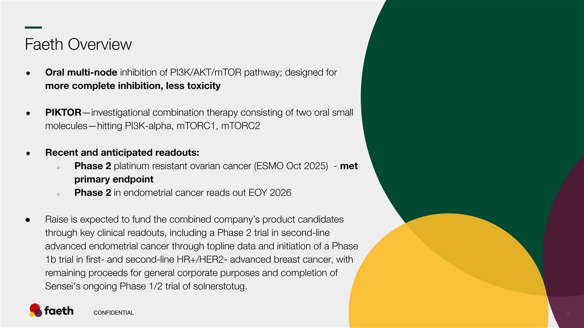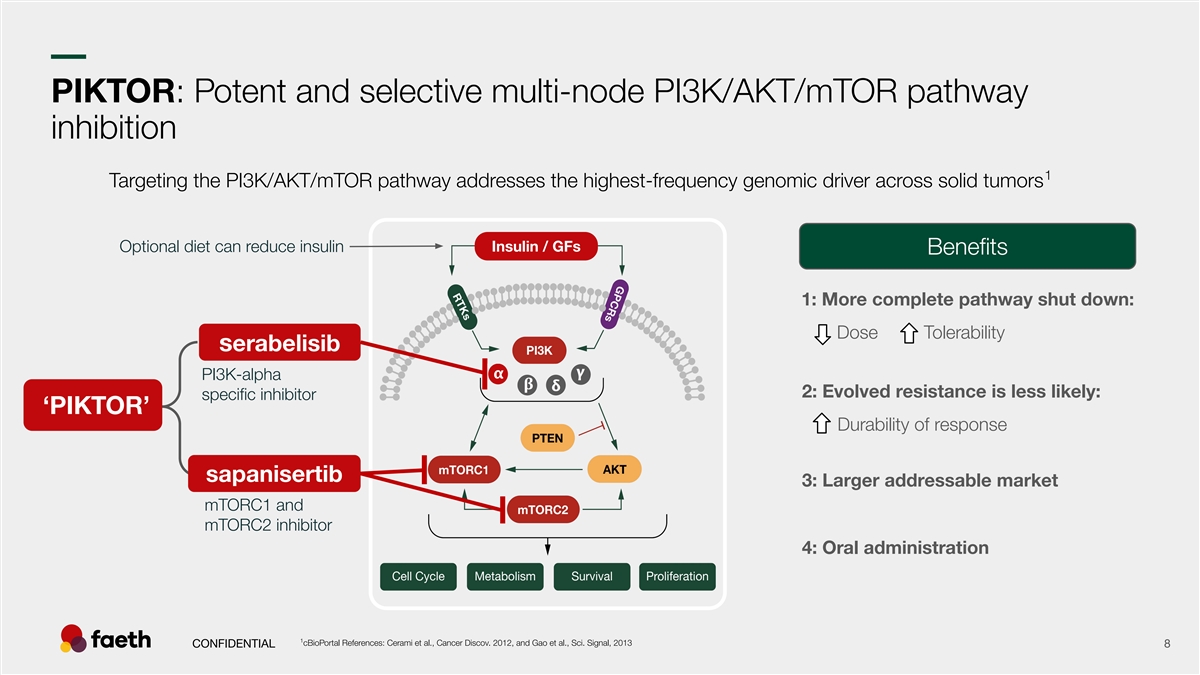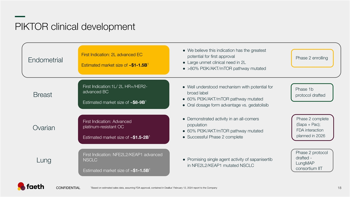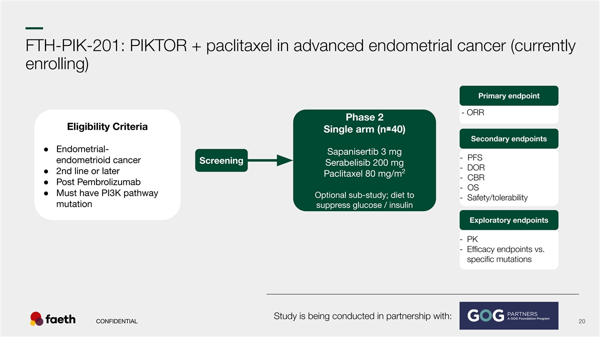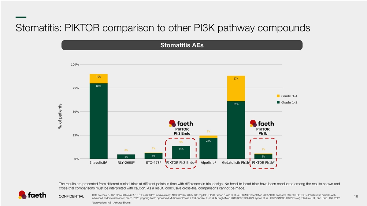 –– Stomatitis: PIKTOR comparison to other PI3K pathway compounds Stomatitis AEs PIKTOR PIKTOR Ph2 Endo Ph1b The results are presented from different clinical trials at different points in time with differences in trial design. No head-to-head trials have been conducted among the results shown and cross-trial comparisons must be interpreted with caution. As a result, conclusive cross-trial comparisons cannot be made. 1 2 3 4 Data sources: J Clin Oncol 2024;42:1-10 RLY-2608 Ph1 (+fulvestrant): ASCO Poster 2025, 600 mg BID, RP2D Cohort Juric D. et. al. ESMO Presentation 2025 Data snapshot PIK-201 PIKTOR + Paclitaxel in patients with CONFIDENTIAL 16 5 6 7 advanced endometrial cancer, 05-01-2026 (ongoing Faeth Sponsored Multicenter Phase 2 trial) Andre, F. et. al. N Engl J Med 2019;380:1929-40 Layman et. al., 2022 (SABCS 2022 Poster) Starks et. al., Gyn. Onc. 166, 2022 Abbreviations: AE - Adverse Events % of patients % of patients