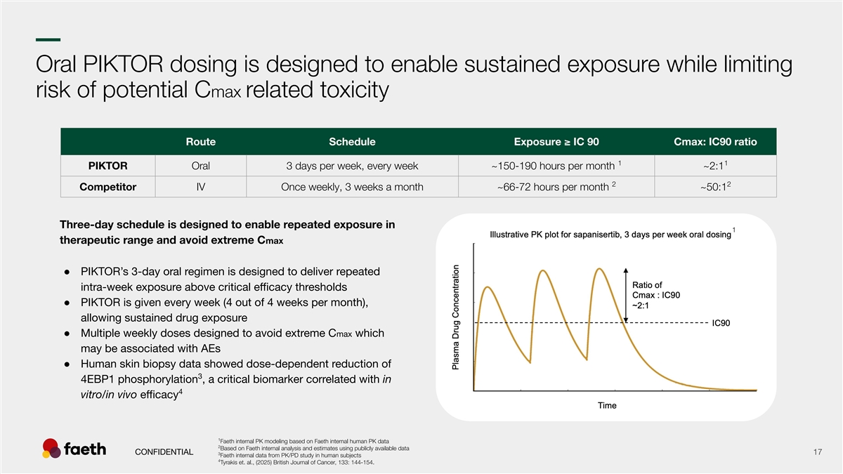 –– Oral PIKTOR dosing is designed to enable sustained exposure while limiting risk of potential Cmax related toxicity Route Schedule Exposure ≥ IC 90 Cmax: IC90 ratio 1 1 PIKTOR Oral 3 days per week, every week ~150-190 hours per month ~2:1 2 2 Competitor IV Once weekly, 3 weeks a month ~66-72 hours per month ~50:1 Three-day schedule is designed to enable repeated exposure in 1 therapeutic range and avoid extreme Cmax ● PIKTOR’s 3-day oral regimen is designed to deliver repeated intra-week exposure above critical efficacy thresholds ● PIKTOR is given every week (4 out of 4 weeks per month), allowing sustained drug exposure ● Multiple weekly doses designed to avoid extreme Cmax which may be associated with AEs ● Human skin biopsy data showed dose-dependent reduction of 3 4EBP1 phosphorylation , a critical biomarker correlated with in 4 vitro/in vivo efficacy 1 Faeth internal PK modeling based on Faeth internal human PK data 2 Based on Faeth internal analysis and estimates using publicly available data CONFIDENTIAL 17 3 Faeth internal data from PK/PD study in human subjects 4 Tyrakis et. al., (2025) British Journal of Cancer, 133: 144-154.