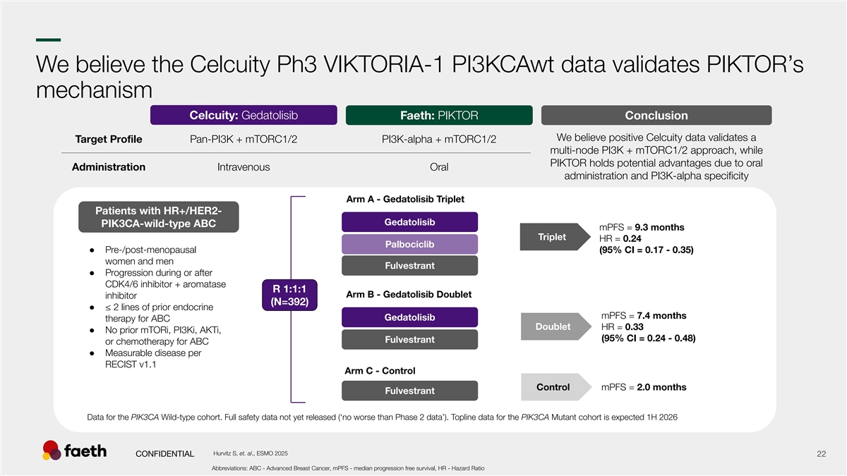 –– We believe the Celcuity Ph3 VIKTORIA-1 PI3KCAwt data validates PIKTOR’s mechanism Celcuity: Gedatolisib Faeth: PIKTOR Conclusion We believe positive Celcuity data validates a Target Profile Pan-PI3K + mTORC1/2 PI3K-alpha + mTORC1/2 multi-node PI3K + mTORC1/2 approach, while PIKTOR holds potential advantages due to oral Administration Intravenous Oral administration and PI3K-alpha specificity Arm A - Gedatolisib Triplet Patients with HR+/HER2- Gedatolisib PIK3CA-wild-type ABC mPFS = 9.3 months Triplet HR = 0.24 Palbociclib ● Pre-/post-menopausal (95% CI = 0.17 - 0.35) women and men Fulvestrant ● Progression during or after CDK4/6 inhibitor + aromatase R 1:1:1 Arm B - Gedatolisib Doublet inhibitor (N=392) ● ≤ 2 lines of prior endocrine mPFS = 7.4 months Gedatolisib therapy for ABC Doublet HR = 0.33 ● No prior mTORi, PI3Ki, AKTi, (95% CI = 0.24 - 0.48) Fulvestrant or chemotherapy for ABC ● Measurable disease per RECIST v1.1 Arm C - Control Control mPFS = 2.0 months Fulvestrant Data for the PIK3CA Wild-type cohort. Full safety data not yet released (‘no worse than Phase 2 data’). Topline data for the PIK3CA Mutant cohort is expected 1H 2026 Hurvitz S, et. al., ESMO 2025 CONFIDENTIAL 22 Abbreviations: ABC - Advanced Breast Cancer, mPFS - median progression free survival, HR - Hazard Ratio