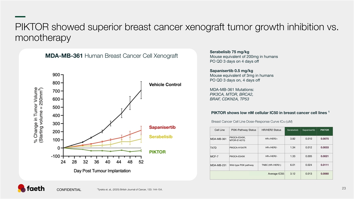 –– PIKTOR showed superior breast cancer xenograft tumor growth inhibition vs. monotherapy Serabelisib 75 mg/kg MDA-MB-361 Human Breast Cancer Cell Xenograft Mouse equivalent of 200mg in humans PO QD 3 days on 4 days off Sapanisertib 0.5 mg/kg Mouse equivalent of 3mg in humans PO QD 3 days on, 4 days off MDA-MB-361 Mutations: PIK3CA, MTOR, BRCA2, BRAF, CDKN2A, TP53 1 PIKTOR shows low nM cellular IC50 in breast cancer cell lines 1 23 Tyrakis et. al., (2025) British Journal of Cancer, 133: 144-154. CONFIDENTIAL Vehicle Control Sapanisertib Serabelisib PIKTOR
