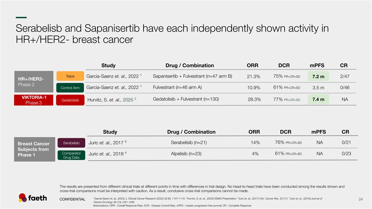–– Serabelisb and Sapanisertib have each independently shown activity in HR+/HER2- breast cancer Study Drug / Combination ORR DCR mPFS CR 1 Sapa Garcia-Saenz et. al., 2022 Sapanisertib + Fulvestrant (n=47 arm B) 75% PR+CR+SD 21.3% 2/47 7.2 m HR+/HER2- Phase 2 1 Fulvestrant (n=46 arm A) 61% PR+CR+SD Control Arm Garcia-Saenz et. al., 2022 0/46 10.9% 3.5 m VIKTORIA-1 2 Gedatolisib + Fulvestrant (n=130) 28.3% 77% PR+CR+SD 7.4 m NA Gedatolisib Hurvitz, S. et. al., 2025 Phase 3 Study Drug / Combination ORR DCR mPFS CR 3 76% PR+CR+SD Serabelisib (n=21) 14% NA 0/21 Serabelisb Juric et. al., 2017 Breast Cancer Subjects from 4 Comparator 61% PR+CR+SD Alpelisib (n=23) NA 0/23 Juric et. al., 2018 4% Phase 1 Drug Data The results are presented from different clinical trials at different points in time with differences in trial design. No head-to-head trials have been conducted among the results shown and cross-trial comparisons must be interpreted with caution. As a result, conclusive cross-trial comparisons cannot be made. 1 2 3 4 Garcia-Saenz et. al., (2022) J. Clinical Cancer Research (2022) 28 (6): 1107–1116 Hurvitz, S. et. al., (2025) ESMO Presentation Juric et. al., (2017) Clin. Cancer Res. 23 (17) Juric et. al., (2018) Journal of CONFIDENTIAL 24 Clinical Oncology 36 (13),1291-1299 Abbreviations: ORR - Overall Response Rate, DCR - Disease Control Rate, mPFS - median progression free survival, CR - Complete Response