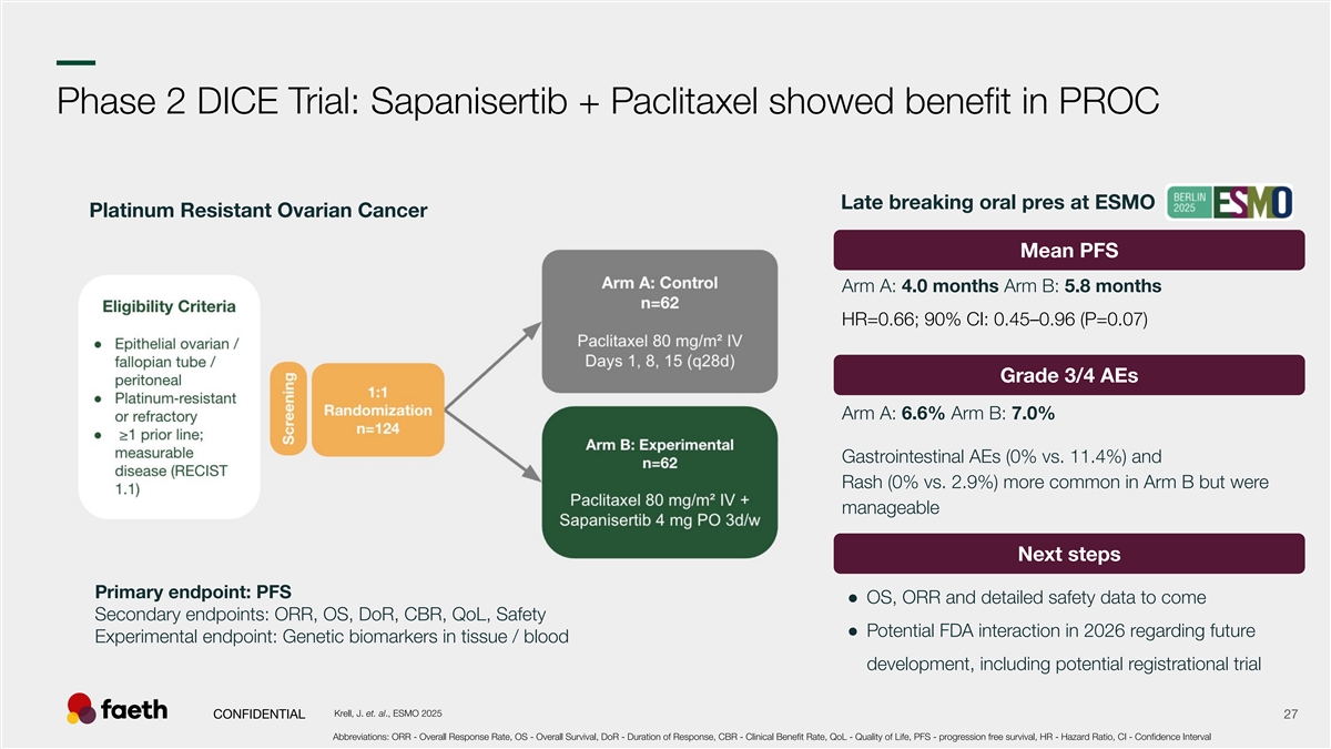 –– Phase 2 DICE Trial: Sapanisertib + Paclitaxel showed benefit in PROC Late breaking oral pres at ESMO Platinum Resistant Ovarian Cancer Mean PFS Arm A: 4.0 months Arm B: 5.8 months HR=0.66; 90% CI: 0.45–0.96 (P=0.07) Grade 3/4 AEs Arm A: 6.6% Arm B: 7.0% Gastrointestinal AEs (0% vs. 11.4%) and Rash (0% vs. 2.9%) more common in Arm B but were manageable Next steps Primary endpoint: PFS ● OS, ORR and detailed safety data to come Secondary endpoints: ORR, OS, DoR, CBR, QoL, Safety ● Potential FDA interaction in 2026 regarding future Experimental endpoint: Genetic biomarkers in tissue / blood development, including potential registrational trial Krell, J. et. al., ESMO 2025 CONFIDENTIAL 27 Abbreviations: ORR - Overall Response Rate, OS - Overall Survival, DoR - Duration of Response, CBR - Clinical Benefit Rate, QoL - Quality of Life, PFS - progression free survival, HR - Hazard Ratio, CI - Confidence Interval