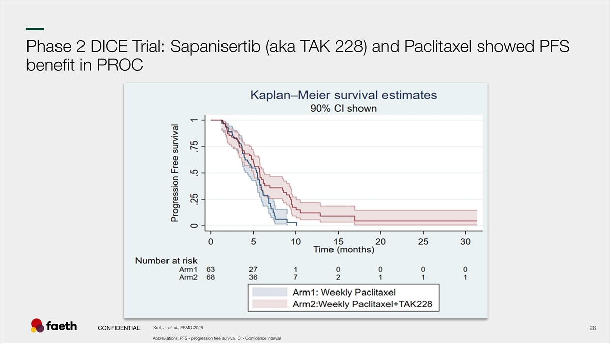 –– Phase 2 DICE Trial: Sapanisertib (aka TAK 228) and Paclitaxel showed PFS benefit in PROC Krell, J. et. al., ESMO 2025 CONFIDENTIAL 28 Abbreviations: PFS - progression free survival, CI - Confidence Interval 28