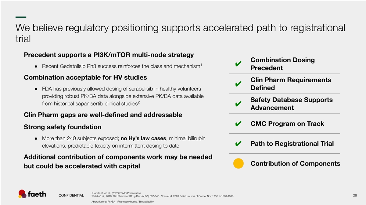 –– We believe regulatory positioning supports accelerated path to registrational trial Precedent supports a PI3K/mTOR multi-node strategy Combination Dosing 1✔ ● Recent Gedatolisib Ph3 success reinforces the class and mechanism Precedent Combination acceptable for HV studies Clin Pharm Requirements ✔ Defined ● FDA has previously allowed dosing of serabelisib in healthy volunteers providing robust PK/BA data alongside extensive PK/BA data available Safety Database Supports 2 from historical sapanisertib clinical studies ✔ Advancement Clin Pharm gaps are well-defined and addressable ✔ CMC Program on Track Strong safety foundation ● More than 240 subjects exposed; no Hy’s law cases, minimal bilirubin Path to Registrational Trial ✔ elevations, predictable toxicity on intermittent dosing to date Additional contribution of components work may be needed Contribution of Components but could be accelerated with capital 1 Hurvitz, S. et. al., (2025) ESMO Presentation 2 CONFIDENTIAL 29 Patel et. al., 2019, Clin Pharmacol Drug Dev Jul;8(5):637-646., Voss et al. 2020 British Journal of Cancer Nov;123(11):1590-1598 Abbreviations: PK/BA - Pharmacokinetics / Bioavailability