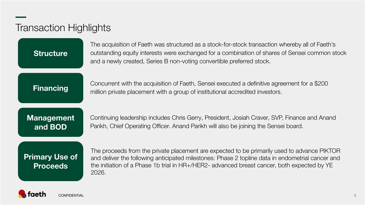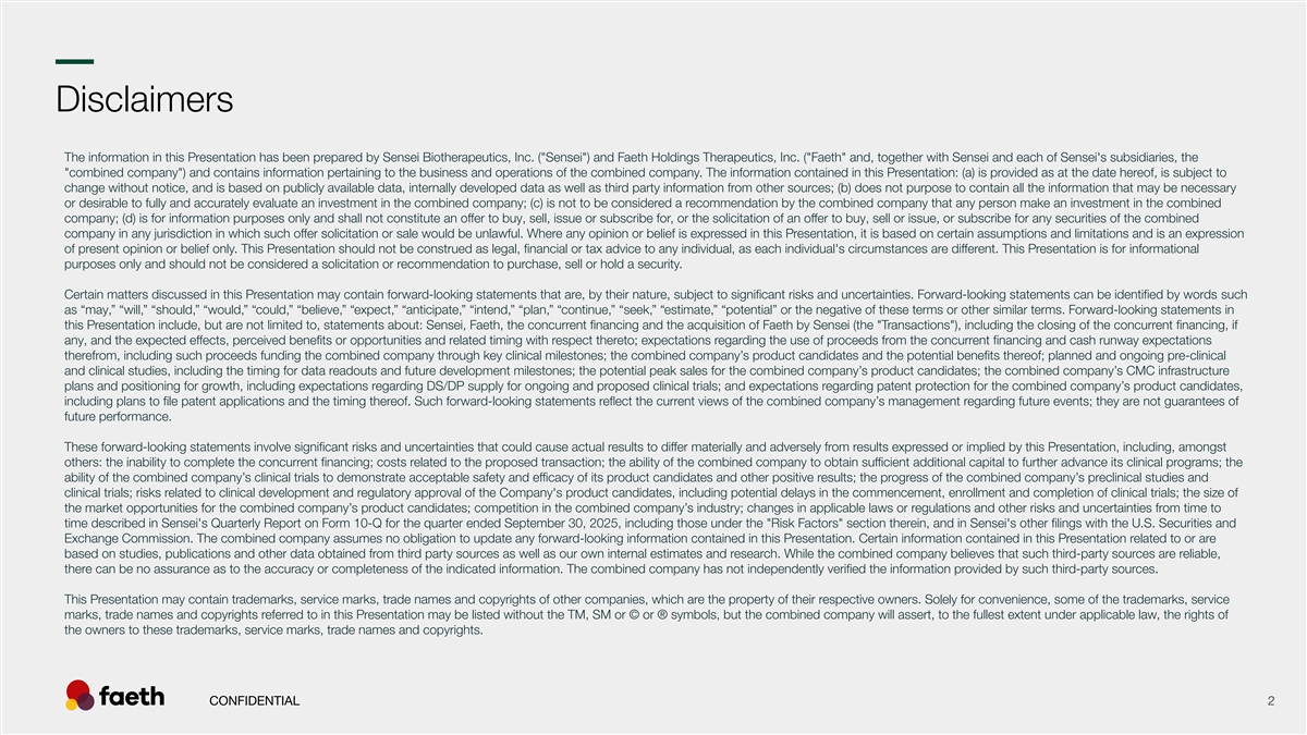 –– Disclaimers The information in this Presentation has been prepared by Sensei Biotherapeutics, Inc. ( Sensei ) and Faeth Holdings Therapeutics, Inc. ( Faeth and, together with Sensei and each of Sensei's subsidiaries, the combined company ) and contains information pertaining to the business and operations of the combined company. The information contained in this Presentation: (a) is provided as at the date hereof, is subject to change without notice, and is based on publicly available data, internally developed data as well as third party information from other sources; (b) does not purpose to contain all the information that may be necessary or desirable to fully and accurately evaluate an investment in the combined company; (c) is not to be considered a recommendation by the combined company that any person make an investment in the combined company; (d) is for information purposes only and shall not constitute an offer to buy, sell, issue or subscribe for, or the solicitation of an offer to buy, sell or issue, or subscribe for any securities of the combined company in any jurisdiction in which such offer solicitation or sale would be unlawful. Where any opinion or belief is expressed in this Presentation, it is based on certain assumptions and limitations and is an expression of present opinion or belief only. This Presentation should not be construed as legal, financial or tax advice to any individual, as each individual's circumstances are different. This Presentation is for informational purposes only and should not be considered a solicitation or recommendation to purchase, sell or hold a security. Certain matters discussed in this Presentation may contain forward-looking statements that are, by their nature, subject to significant risks and uncertainties. Forward-looking statements can be identified by words such as “may,” “will,” “should,” “would,” “could,” “believe,” “expect,” “anticipate,” “intend,” “plan,” “continue,” “seek,” “estimate,” “potential” or the negative of these terms or other similar terms. Forward-looking statements in this Presentation include, but are not limited to, statements about: Sensei, Faeth, the concurrent financing and the acquisition of Faeth by Sensei (the Transactions ), including the closing of the concurrent financing, if any, and the expected effects, perceived benefits or opportunities and related timing with respect thereto; expectations regarding the use of proceeds from the concurrent financing and cash runway expectations therefrom, including such proceeds funding the combined company through key clinical milestones; the combined company’s product candidates and the potential benefits thereof; planned and ongoing pre-clinical and clinical studies, including the timing for data readouts and future development milestones; the potential peak sales for the combined company’s product candidates; the combined company’s CMC infrastructure plans and positioning for growth, including expectations regarding DS/DP supply for ongoing and proposed clinical trials; and expectations regarding patent protection for the combined company’s product candidates, including plans to file patent applications and the timing thereof. Such forward-looking statements reflect the current views of the combined company’s management regarding future events; they are not guarantees of future performance. These forward-looking statements involve significant risks and uncertainties that could cause actual results to differ materially and adversely from results expressed or implied by this Presentation, including, amongst others: the inability to complete the concurrent financing; costs related to the proposed transaction; the ability of the combined company to obtain sufficient additional capital to further advance its clinical programs; the ability of the combined company’s clinical trials to demonstrate acceptable safety and efficacy of its product candidates and other positive results; the progress of the combined company’s preclinical studies and clinical trials; risks related to clinical development and regulatory approval of the Company's product candidates, including potential delays in the commencement, enrollment and completion of clinical trials; the size of the market opportunities for the combined company’s product candidates; competition in the combined company’s industry; changes in applicable laws or regulations and other risks and uncertainties from time to time described in Sensei's Quarterly Report on Form 10-Q for the quarter ended September 30, 2025, including those under the Risk Factors section therein, and in Sensei's other filings with the U.S. Securities and Exchange Commission. The combined company assumes no obligation to update any forward-looking information contained in this Presentation. Certain information contained in this Presentation related to or are based on studies, publications and other data obtained from third party sources as well as our own internal estimates and research. While the combined company believes that such third-party sources are reliable, there can be no assurance as to the accuracy or completeness of the indicated information. The combined company has not independently verified the information provided by such third-party sources. This Presentation may contain trademarks, service marks, trade names and copyrights of other companies, which are the property of their respective owners. Solely for convenience, some of the trademarks, service marks, trade names and copyrights referred to in this Presentation may be listed without the TM, SM or © or ® symbols, but the combined company will assert, to the fullest extent under applicable law, the rights of the owners to these trademarks, service marks, trade names and copyrights. CONFIDENTIAL 2