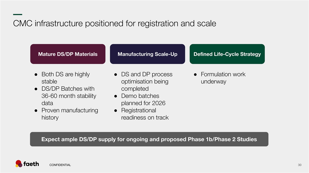 –– CMC infrastructure positioned for registration and scale Mature DS/DP Materials Manufacturing Scale-Up Defined Life-Cycle Strategy ● Both DS are highly ● DS and DP process ● Formulation work stable optimisation being underway ● DS/DP Batches with completed 36-60 month stability ● Demo batches data planned for 2026 ● Proven manufacturing ● Registrational history readiness on track Expect ample DS/DP supply for ongoing and proposed Phase 1b/Phase 2 Studies CONFIDENTIAL 30