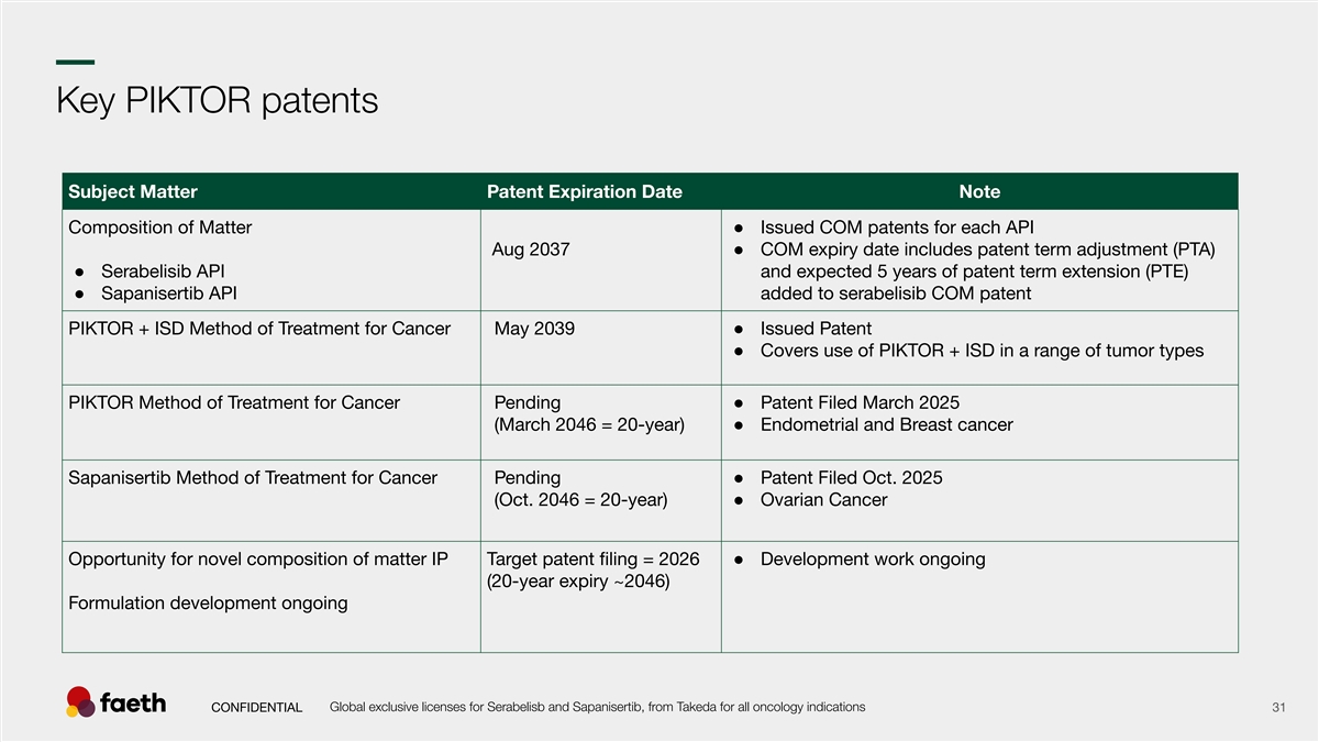 –– Key PIKTOR patents Subject Matter Patent Expiration Date Note Composition of Matter ● Issued COM patents for each API Aug 2037● COM expiry date includes patent term adjustment (PTA) ● Serabelisib API and expected 5 years of patent term extension (PTE) ● Sapanisertib API added to serabelisib COM patent PIKTOR + ISD Method of Treatment for Cancer May 2039● Issued Patent ● Covers use of PIKTOR + ISD in a range of tumor types PIKTOR Method of Treatment for Cancer Pending ● Patent Filed March 2025 (March 2046 = 20-year)● Endometrial and Breast cancer Sapanisertib Method of Treatment for Cancer Pending ● Patent Filed Oct. 2025 (Oct. 2046 = 20-year)● Ovarian Cancer Opportunity for novel composition of matter IP Target patent filing = 2026 ● Development work ongoing (20-year expiry ~2046) Formulation development ongoing Global exclusive licenses for Serabelisb and Sapanisertib, from Takeda for all oncology indications CONFIDENTIAL 31