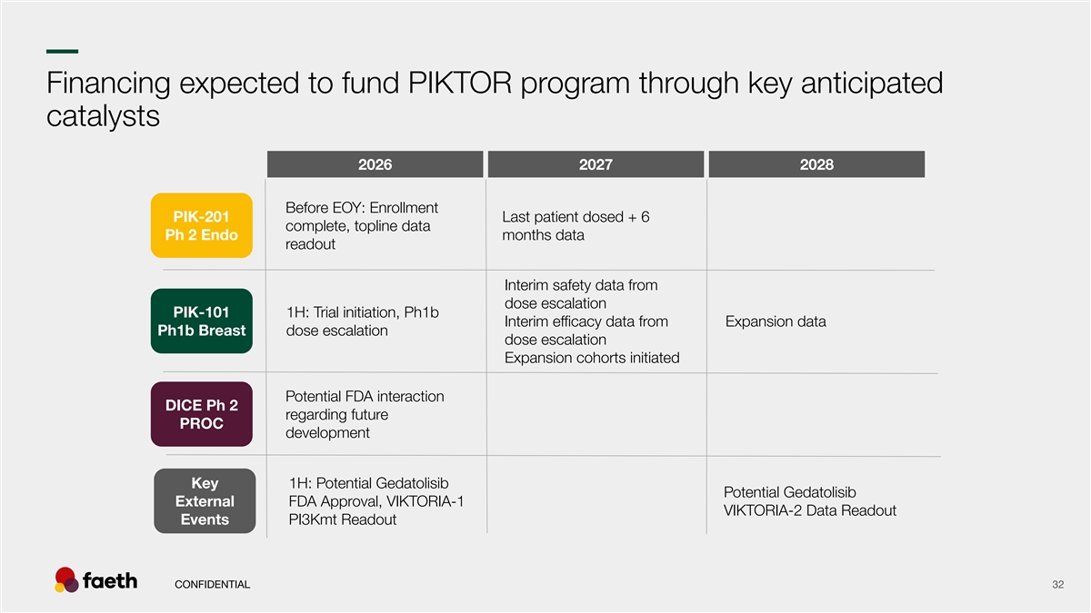–– Financing expected to fund PIKTOR program through key anticipated catalysts 2026 2027 2028 Before EOY: Enrollment PIK-201 Last patient dosed + 6 complete, topline data Ph 2 Endo months data readout Interim safety data from dose escalation PIK-101 1H: Trial initiation, Ph1b Interim efficacy data from Expansion data Ph1b Breast dose escalation dose escalation Expansion cohorts initiated Potential FDA interaction DICE Ph 2 regarding future PROC development Key 1H: Potential Gedatolisib Potential Gedatolisib External FDA Approval, VIKTORIA-1 VIKTORIA-2 Data Readout Events PI3Kmt Readout CONFIDENTIAL 32