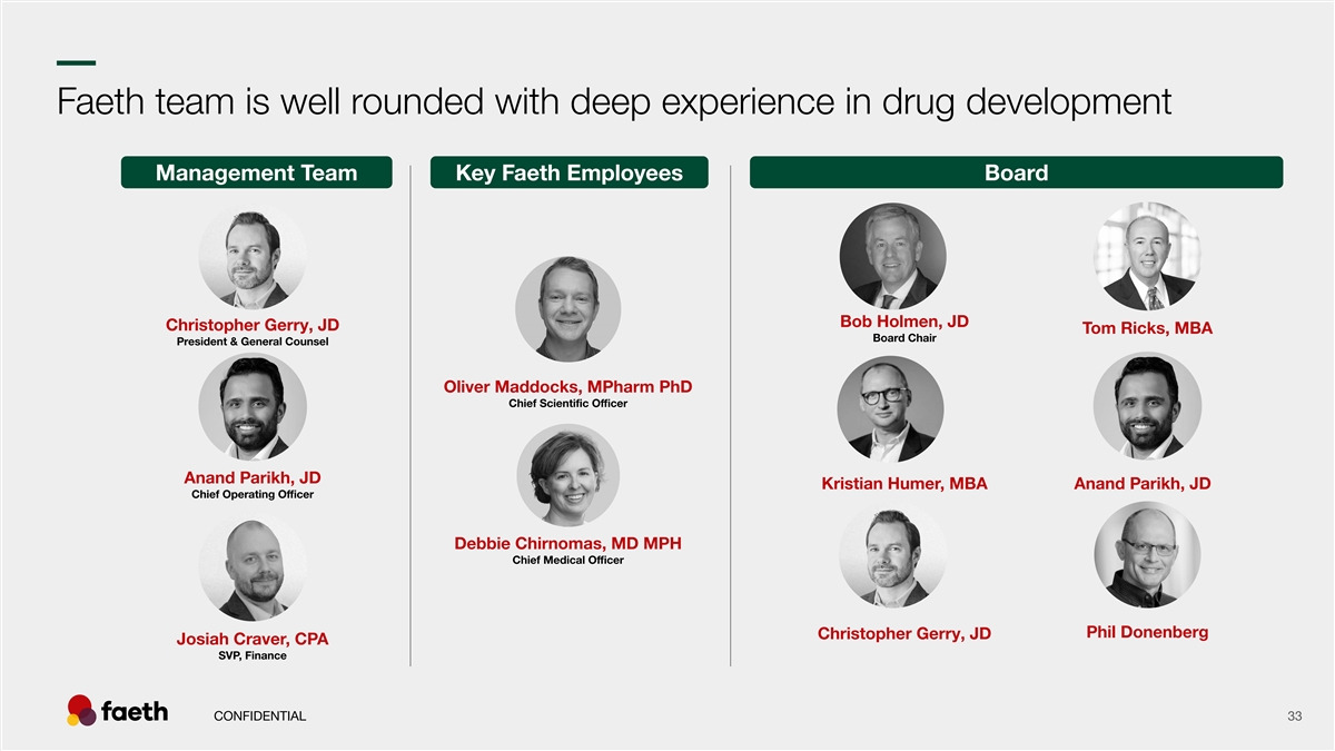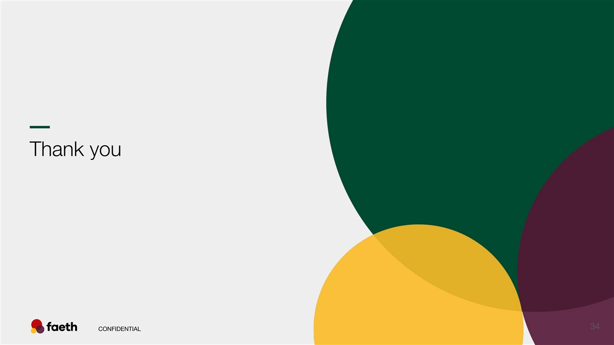 –– Faeth team is well rounded with deep experience in drug development Management Team Key Faeth Employees Board Bob Holmen, JD Christopher Gerry, JD Tom Ricks, MBA Board Chair President & General Counsel Oliver Maddocks, MPharm PhD Chief Scientific Officer Anand Parikh, JD Kristian Humer, MBA Anand Parikh, JD Chief Operating Officer Debbie Chirnomas, MD MPH Chief Medical Officer Phil Donenberg Christopher Gerry, JD Josiah Craver, CPA SVP, Finance CONFIDENTIAL 33