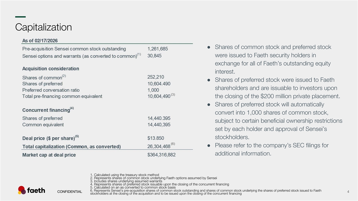 –– Transaction Highlights The acquisition of Faeth was structured as a stock-for-stock transaction whereby all of Faeth’s outstanding equity interests were exchanged for a combination of shares of Sensei common stock Structure and a newly created, Series B non-voting convertible preferred stock. Concurrent with the acquisition of Faeth, Sensei executed a definitive agreement for a $200 Financing million private placement with a group of institutional accredited investors. Continuing leadership includes Chris Gerry, President, Josiah Craver, SVP, Finance and Anand Management Parikh, Chief Operating Officer. Anand Parikh will also be joining the Sensei board. and BOD The proceeds from the private placement are expected to be primarily used to advance PIKTOR Primary Use of and deliver the following anticipated milestones: Phase 2 topline data in endometrial cancer and the initiation of a Phase 1b trial in HR+/HER2- advanced breast cancer, both expected by YE Proceeds 2026. CONFIDENTIAL 3