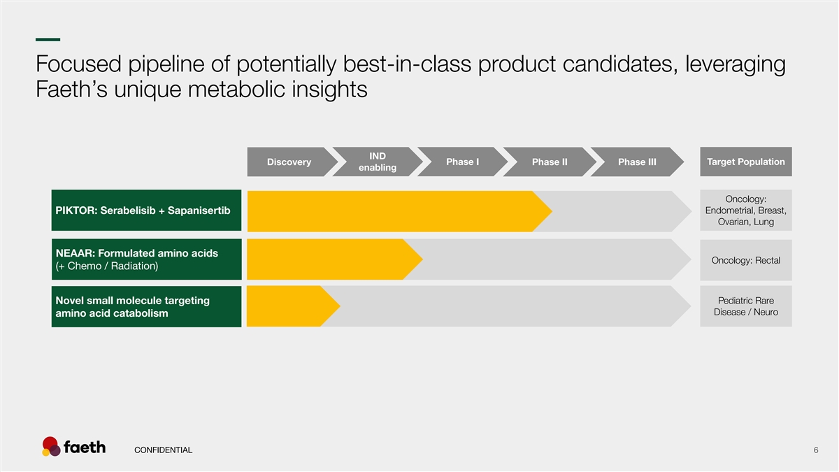 –– Faeth Overview ● Oral multi-node inhibition of PI3K/AKT/mTOR pathway; designed for more complete inhibition, less toxicity ● PIKTOR—investigational combination therapy consisting of two oral small molecules—hitting PI3K-alpha, mTORC1, mTORC2 ● Recent and anticipated readouts: ○ Phase 2 platinum resistant ovarian cancer (ESMO Oct 2025) - met primary endpoint ○ Phase 2 in endometrial cancer reads out EOY 2026 ● Raise is expected to fund the combined company’s product candidates through key clinical readouts, including a Phase 2 trial in second-line advanced endometrial cancer through topline data and initiation of a Phase 1b trial in first- and second-line HR+/HER2- advanced breast cancer, with remaining proceeds for general corporate purposes and completion of Sensei's ongoing Phase 1/2 trial of solnerstotug. CONFIDENTIAL 5