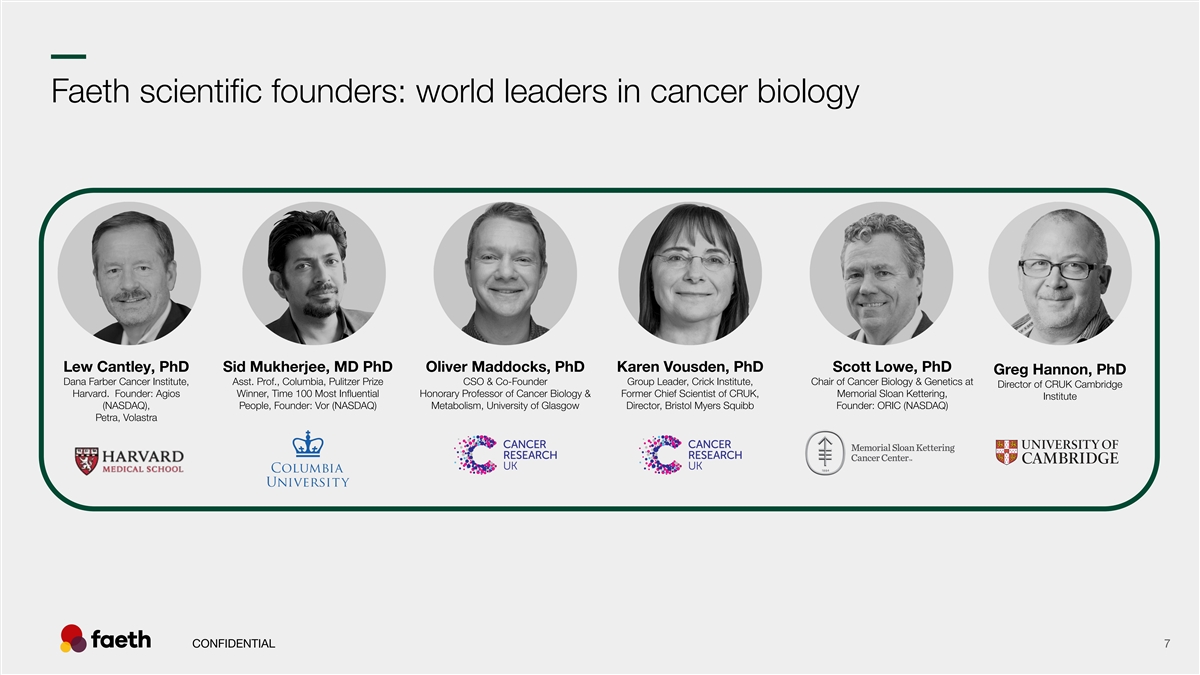 –– Faeth scientific founders: world leaders in cancer biology Lew Cantley, PhD Sid Mukherjee, MD PhD Oliver Maddocks, PhD Karen Vousden, PhD Scott Lowe, PhD Greg Hannon, PhD Dana Farber Cancer Institute, Asst. Prof., Columbia, Pulitzer Prize CSO & Co-Founder Group Leader, Crick Institute, Chair of Cancer Biology & Genetics at Director of CRUK Cambridge Harvard. Founder: Agios Winner, Time 100 Most Influential Honorary Professor of Cancer Biology & Former Chief Scientist of CRUK, Memorial Sloan Kettering, Institute (NASDAQ), People, Founder: Vor (NASDAQ) Metabolism, University of Glasgow Director, Bristol Myers Squibb Founder: ORIC (NASDAQ) Petra, Volastra CONFIDENTIAL 7